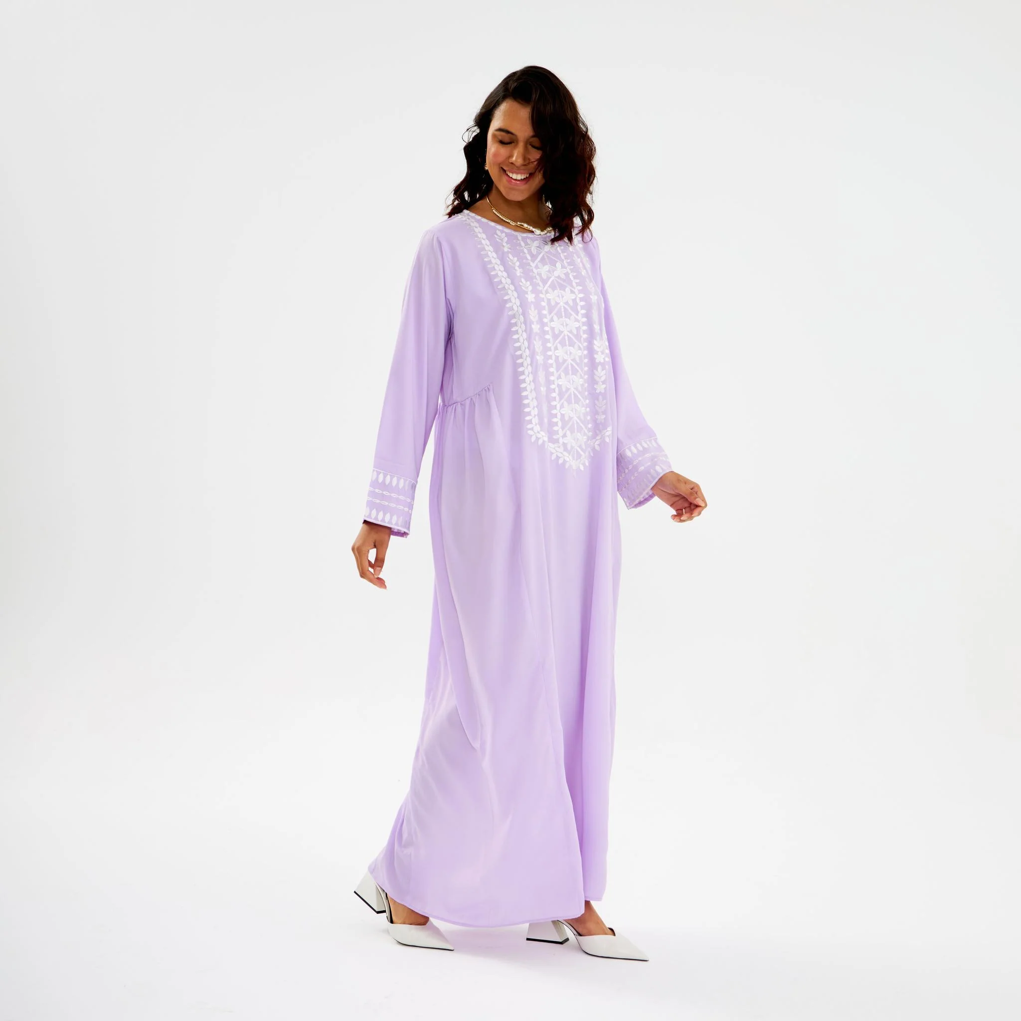The Jameela Jalabeya is crafted with the highest quality fabrics, designed for luxury and comfort. With detailing of white embroidery, the jalabeya features gathering on the waist which will be sure to make you feel beautiful and elegant.