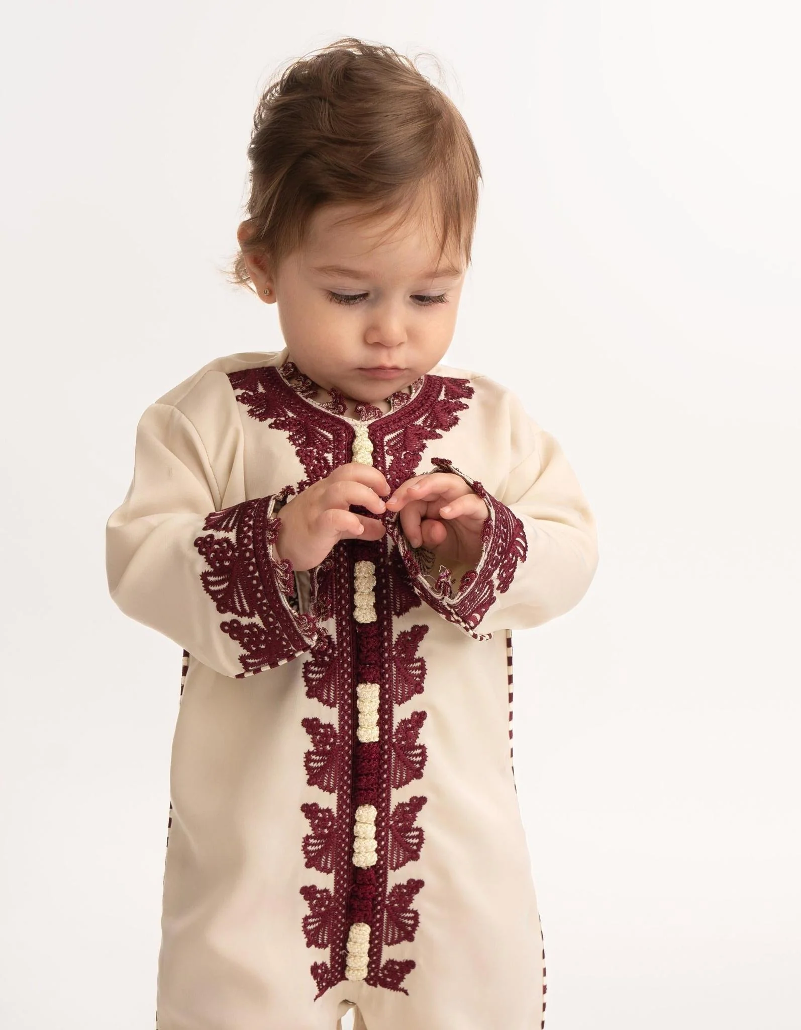 The North African inspired embroided Juwariya jalabeya is crafted with high quality materials, featuring intricate detailing, this jalabeya is sure to be a standout. Every detail of the rich maroon embroidery is designed to standout.